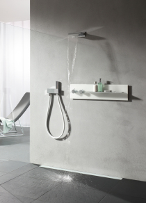 Wohnlichkeit und Sinnlichkeit stehen im Vordergrund dieses neuartigen Duschmöbels, das nichts mit einer herkömmlichen Armatur für Dusche oder Wanne gemeinsam hat. Was auf den ersten Blick wie ein praktisches Regalelement aussieht, zeigt sich bei genauerem Hinsehen als ein außergewöhnliches Armaturenpaneel. Das Paneel aus Glas in verschiedenen Größen hält neben verchromten Bedienelementen zum Einstellen der Wassermenge und -temperatur auch Ablagefläche aus Aluminium in einer oder mehreren Ebenen bereit. Das Armaturenpaneel ist in weiß, Anthrazit oder Trüffel erhältlich.