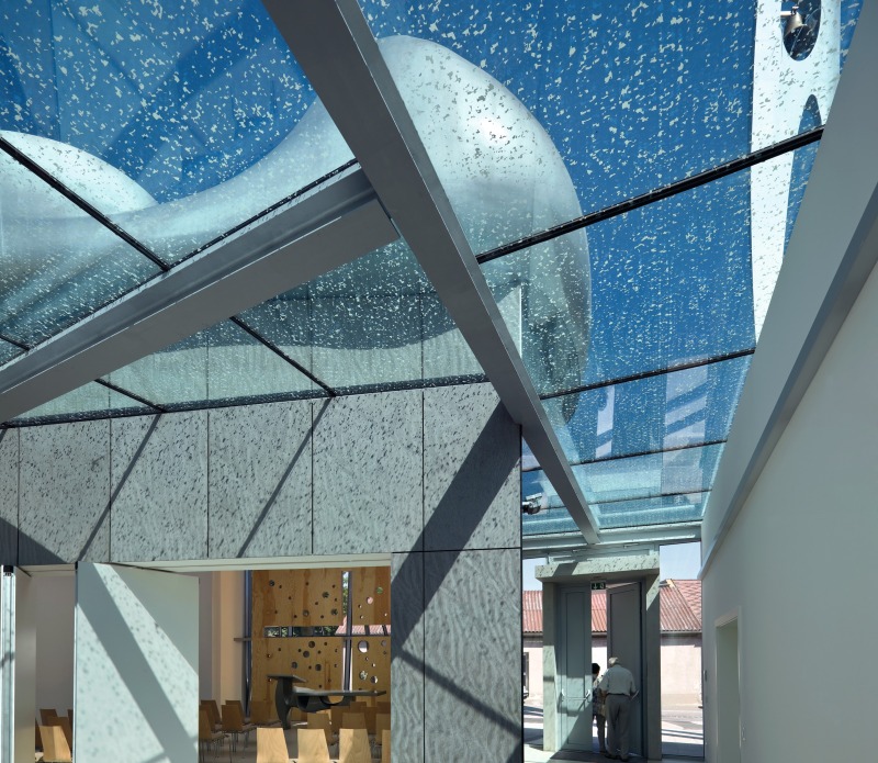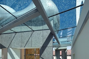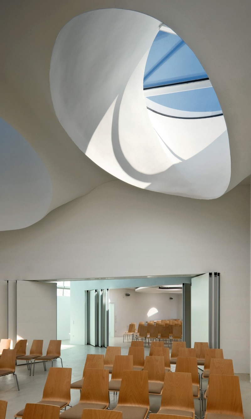 Man kann dieses Dach mit allen möglichen Attributen und Adjektiven beschreiben. Man kann Zahlen und Fakten benennen. Indes, auf diesem Wege wird man dem auf vier bleistift-dünnen, zehn Meter hohen Stahlstützen thronenden oberen Gebäudeabschluss nicht gerecht. Das Dach ist ein Erlebnis. Wie ein Wolke, die mal eben auf dem Kirchenbau ruht. Wie hingehaucht - um nachher weiterzuwandern. „Architektur veränderbar wie Wolken zu machen“, lautete der Vorsatz in Coops Anfängen. Dieses Temporäre, dieses Leichte, dieses fast schicksalshaft Zufällige des Wolkendaches ist vielleicht – jenseits der drei Öffnungen, die man allzu schnell, allzu platt als ein Symbol für die Trinität erklärte – die Verbindung zum Jenseitigen, die man einer Kirche für angemessen hält. Man denkt an die Kirchenarchitektur der 50er, 60er Jahre im vergangenen Jahrhundert und all die teilweise fantastischen Versuche, mit der Inszenierung des Lichts das Numinose des Glaubenserlebnisses ästhetisch zu bewältigen. Prix hat mit diesem Dach ein herrlich stimmiges Gleichnis gefunden, das dem Betrachter über manch allzu Sachliches, manch allzu Banales des Glaubensgebäudes hinwegtröstet.