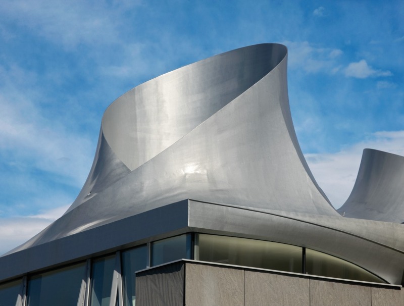 Wolf D. Prix hat für die evangelische Kirche seiner Heimatstadt ein silbrig schimmerndes Dach entworfen, das in freien Formen und drei Öffnungen die Verbindung zwischen dem Dies- und Jenseitigen symbolisieren soll.