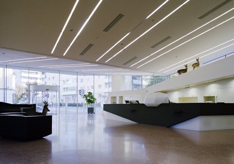 Gemeinsam mit der Bauherrenschaft wurde ein bedürfnisgerecht maßgeschneiderter, skulpturaler Baukörper entwickelt. Das Finetuning für die Filiale mit ihren 20 MitarbeiterInnen, Seminarräumen zur firmeninternen Ausbildung, Büros und anderen Assets, die der etwa 140-köpfigen, teils aus dem Altbau abgesiedelten Belegschaft ein einzigartiges Arbeitsumfeld bieten, dauerte fast ein Jahr. Dynamisch mäandern nun unter einer bergig anmutenden Dachlandschaft an weiten Gängen, die von Foyers, Galerien, Lounges und Treppen durchzogen sind, die Büroebenen entlang. In ihren Fensterbändern, die bündig in der ockerfarbenen Fassade sitzen, spiegeln sich Altbau, Himmel und Stadt.