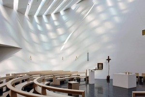 Der Kirchenraum ist geprägt durch seine abgerundeten Wände und die schier zahllos aneinander gereihten Oberlichtbänder in Nord-Süd-Richtung. Diese Tageslichtstreifen weisen ebenfalls wellenförmige Verschlankungen auf, die sich vor allem in einem unregelmäßigen Schattenwurf bemerkbar machen. Des Weiteren setzten die Architekten bewusst unterschiedliche Glastönungen bei den einzelnen Oberlichtelementen ein.