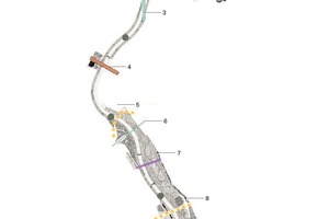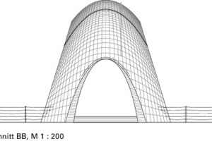 Die Tragkonstruktion der Puente Cascara ist eine Schale aus Ortbeton, die sich elegant über 41,5 m von einer Uferseite zur anderen spannt und einseitig auf der Wand des Straßentunnels aufliegt.