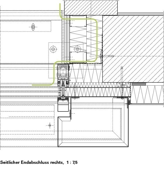 Wie schon bei der Gestaltung der Fassade legten die Architekten viel Wert darauf, die technischen Bauteile in die Architektur zu integrieren. In den Bürotrakten sind alle Technikelemente in dem 25cm hohen Doppelboden verborgen. Alle Steckdosen für Strom und EDV befinden sich im Fußboden. In jedem Büroraum sorgt ein Drallauslass im Boden für die Versorgung mit Zuluft. Die Abluft wird durch schmale Überstromschlitze über den Türen abgeführt und in der Wand durch Entschleunigung schallgedämmt. Aus einer gegenüberliegenden Schlitzöffnung strömt die Luft dann in den Flur und wird dort über eine Schattenfuge zwischen Wand und Decke abgesaugt. Von dort geht die Abluft durch Kanäle zum Wärmeübertrager im Technikraum und schließlich als Fortluft nach draußen.
