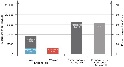 (m²a). 24 kWh/(m²a) davon oder 6 170 kWh/a wurden aus dem Stromnetz bezogen. Durch die Optimierung der Systeme soll der Deckungsanteil für Eigenstrom auf 45 bis 50 % gesteigert werden.