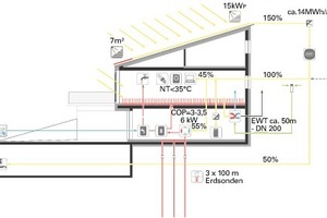 Die Wärmeversorgung erfolgt durch eine elektrische, erdgekoppelte Wasser/Wasser-Wärmepumpe, die drei Erdsonden mit je 97 m Länge als Energiequelle nutzt. Grundgedanke des Energiekonzeptes ist eine Versorgung der elektrischen Verbraucher über die Photovoltaikanlage (15kWp), die vollflächig auf dem 17° geneigten Pultdach installiert ist. Für die Versorgung in den Abendstunden werden zusätzliche Erträge in zwei Batterien (7 kWh und 20 kWh) gespeichert. Neben der vorrangigen Direktstromnutzung wird der solar erzeugte Strom für das Elektroauto verwendet. Erst wenn die Speicherkapazitäten im und am Gebäude erschöpft sind, wird der Überschuss in das öffentliche Netz eingespeist.