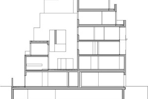 Nicht ein Haus, sondern vielmehr ein Ensemble mit einem siebengeschossigen, abgewinkelten „Vorderhaus“ mit fünf Wohnungen sowie zwei Hofhäusern, fünf- und dreigeschossig, entwickelte der Architekt auf der Baulücke. Eine sehr dichte Bebauung mit 1 700 m² Bruttogeschossfläche, die überraschend viele wie vielgestaltige Freiräume und Einschnitte auf verschiedenen Niveaus aufweist, die nun vor allem viel Tageslicht in die Wohnungen bringen. Eine höchst artifizielle Architekturlandschaft mit einer fast schon mediterranen Anmutung ging daraus hervor, die dem sonst so flachen Berlin eine völlig unerwartete Topographie abgewann.