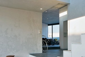 Ein Geschoss hoch geht es von der Straße über eine ins Vorderhaus eingeschnittene Freitreppe zu den beiden Hofhäusern, wo das größere Hofhaus mit einem vorangestellten Patio den Freiraum mit seinen scharfkantigen Einschnitten und auskragenden Volumina entschieden wie dramatisch weitet und sich den Besuchern sehr unterschiedliche Wege um die Häuser anbieten. Einer dieser Wege führt um ein Geschoss tieferen Gartenhof, den sich das kleinere Hofhaus und eine kleine Parterrewohnung gemeinsam teilen. Geschickt inszeniert wechseln sich entlang der Wege überraschend großzügige Festverglasungen mit großen geschlossenen Wandflächen ab, was nur noch mehr die plastischen Qualitäten der nicht rechtwinkligen Monolithen im Wechsel des Tageslichts hervortreten lässt. Was sich erstaunlicher Weise auch im Innern der Häuser bruchlos fortsetzt, deren Wohnungen Niveausprünge nicht scheuen und wo sich gerade auch im Vorderhaus immer wieder abknickende Wege von einem zum anderen Wohnbereich auftun.