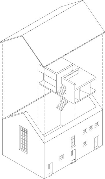 Man betritt das zweigeschossige Gebäude über die rechte Tür. Im Erdgeschoss befinden sich eine 1-Raum-Wohnung mit separatem Eingang – linke Tür –, Küche, Bad sowie zwei Abstellräume und die Diele. Von dort führt eine skulpturale Holztreppe aus Eiche in das obere Geschoss. Dort eröffnet sich Besuchern ein 6,50 m hoher Raum, den die Architekten unbedingt erhalten wollten. „Man bekommt einen Raum geschenkt, den man heutzutage vom Raumvolumen so nicht mehr unbedingt bauen würde“, sagt Architekt Roger Wirtz. Die Idee: Ein Raummöbel gliedert die ehemalige Scheune. Das Raummöbel hat Alfred Wirtz selbst angefertigt, selbstverständlich aus Eichenfurnier – „das ist Berufsethos“, sagt der Schreinermeister lächelnd. Der Wandaufbau: Gipskarton, 15 mm OSB-Platte, Holzständerwerk mit 100 mm Dämmung, 15 mm OSB-Platte, als Abschluss Eichenfurnier. Hinter den Eichentüren befinden sich ein Schlafzimmer, ein Bad und eine Toilette. So bleibt der stützenfreie, lichtdurchflutete Raum erhalten. Das Halbgeschoss des Möbels gliedert den offenen Raum nochmals, indem auf der oberen Ebene eine Galerie entsteht.