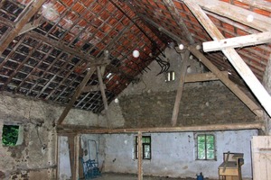 Danach erneuerten sie das Dach: Der Ringbalken und das Sprengwerk wurden ersetzt. Als die Bodenplatte und der Ringbalken erneuert waren, konnte eine neue Betondecke die ehemalige Stahlkonstruktion und die darauf aufliegende Kappendecke ersetzen. Gegen den Erhalt der Stahlkonstruktion und der Kappendecke sprachen die starken Schwingungen. Architekt Wirtz ist von der Betonqualität der Decke im Erdgeschoss begeistert: ein lebendiges Schalbild in Ortbeton mit scharfen Kanten.