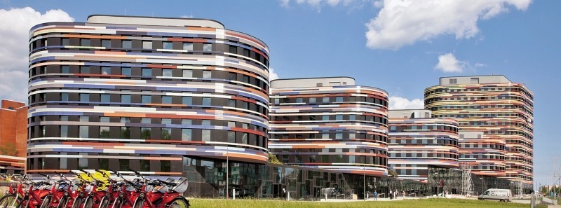 Der Neubau der Behörde für Stadtentwicklung und Umwelt (BSU) in Hamburg bildet eine Landmarke für moderne und energieeffiziente Architektur im Stadtteil Wilhelmsburg. Der von der DGNB mit Gold zertifizierte Behördenbau von Sauerbruch Hutton befindet sich in Nachbarschaft zur Internationalen Bauausstellung (IBA) und wurde zeitgleich mit ihr fertig gestellt. Das wellenförmige, ca. 200 m lange Gebäude besteht aus einem 12-geschossigen, gerundeten Hochhaus von 54 m Höhe, an das zwei 5-geschossige Seitenflügel anschließen. Diese zweigen sich schräg nach hinten vom Hauptturm ab und bilden sich zu vier und drei „Häusern“ aus. Der Vierer-Flügel zeigt die starke Wellenform konträr zum Dreier-Flügel. Die Rückseiten sind jeweils nur leicht konturiert. Der Komplex, ca. 60 000 m2 für etwa 1 500 Mitarbeiter der öffentlichen Verwaltung, Ausstellungsflächen, Bibliothek, Konferenzzentrum und Gastronomie, ist als multifunktionaler Mittelpunkt im Quartier angelegt und spiegelt mit seiner Architektur eine ganz eigene Abfolge von Begegnung, Kommunikation und Interaktion wider. 20 Farbtöne, gebildet aus den drei Grundfarben Blau, Rot, Gelb und dem Mischton Grün, mit jeweils fünf Untertönen, finden sich zu Farbfeldern zusammen, die aneinandergereiht das Gebäude umspannen.