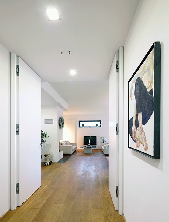 In unmittelbarer Nähe der Havel hat der Architekt Dr.-Ing. Jürgen Fissler ein Wohnhaus auf einem Hanggrundstück in Berlin Kladow gebaut. Für Besucher ist das weiße Gebäude mit Flachdach durch die Form eines Kubus ein Orientierungspunkt in dem gewachsenen Wohnviertel mit überwiegender Ziegeldacharchitektur. Das 2-geschossige Einfamilienhaus mit einer Wohnfläche von 200 m2 wurde 2011 bezogen. Beim Betreten des Wohnhauses empfängt den Besucher eine lichte, offene Innenarchitektur mit Parkettböden, weiß geputzten Wänden, flächenbündigen Türen und hochwertigen Einbauten. Über den Flur gelangt man durch eine raumhohe Doppelflügeltür ohne Sturz in das Wohnzimmer mit einem bodentiefen Fensterelement und Blick in den Garten. Die zukünftigen Bewohner wollten eine Entmaterialisierung des Hauses mit klarer Architektur, reduzierter Farb- und Formensprache sowie eine gradlinige Innenarchitektur. Die Türen und Einbauten sollten zurückhaltend, hochwertig und stabil sein, um ausreichend Freiraum für die Ausstattung der Räume zu lassen. Daher wurden alle Türen individuell aus MDF angefertigt, weiß lackiert und nach einem abgestimmten Detail verdeckt montiert. Es gibt zwei Varianten der ungefälzten Türen im gesamten Gebäude: raumhohe Türen ohne Sturz oder flächenbündige Funktions- und Tapetentüren.
