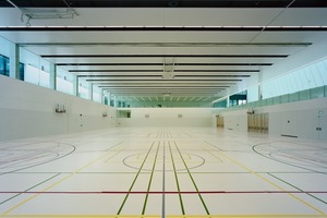 Nirgends tritt die Konstruktion in den Vordergrund, überall dominieren die Sportler mit ihren unterschiedlichen Farben und Bewegungen. Weder wird man des Haupttragwerks von 35 m langen und 57 Tonnen schweren Stahlbetonträgern ansichtig noch der Installationen, die alle hinter Verkleidungen unsichtbar bleiben. Immer wieder ergeben sich dagegen im Gebäude überraschende Durch- und Ausblicke, was die Bewegung im Raum so angenehm wie kurzweilig macht. Weshalb nicht ins Auge fällt, wie geschickt hier ohne jede Besprinklerung mit wenigen Brandschutztoren und verborgenen Fluchtwegen der Brandschutz gelöst wurde.
