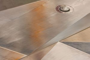 Statt über trübende Verfärbungen sorgten sich die Auftraggeber über gleißende Lichtspiegelungen. Unbegründet, wie der Blick nach oben zeigt: Das Dach hat eine Vintage- statt einer Spiegeloptik. Schleifspuren und die Aussteifungsbleche zeichnen sich auf dem elektropolierten Edelstahl ab, die Oberfläche reflektiert die Umgebung nur schwach als mattes Farbmuster. Julian Schoyerer sagt: „Wir wollten kein High-Tech, sondern die Anmutung einer Jules-Verne-Technik.“ (siehe Bildunterschrift Seite 47) Er verweist auf die Verschraubungen der Stützen mit der Dachunterseite, die an alte Nieten erinnern. Für einen eher unfreiwilligen Vintagelook der Stützen sorgen Werbeaufkleber, die sich hier wie überall im öffentlichen Raum finden. Die aber lassen Schoyerer kalt: „Edelstahl ist eigentlich unkaputtbar. Das Dach wird sicher länger leben als wir und ist dabei fast wartungsfrei.“ Sagt es und zieht einen der Aufkleber ab. Er ergänzt: „Diese Langzeitwirkung eines Bauwerks wird viel zu selten in die Investitionsrechnung der Kommunen einbezogen.“