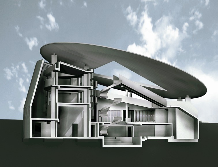 Auf seiner Ostseite neigt es sich auf Augenhöhe des Betrachters und lässt ihn auf das runde Dach schauen und die dreieckige Dachöffnung erkennen. Es offenbart einen Durchgang zu einem Innenhof, der mit dem äußeren Landschaftsraum korrespondiert. Deutlich ablesbar ist die Geometrie des gesamten Baukörpers. Das Volumen des Musikerhauses bilden zwei sich überschneidende Zylinder. Der obere Zylinder neigt sich 14 Grad aus dem Lot, so dass sein kreisförmiges Profil auch aus Fußgängerperspektive wahrnehmbar ist. Auf den Zylinder stützt sich eine kreisförmige Dachscheibe, durchbrochen von einem gleichseitigen Dreieck. Der Architekt erklärt: „Als geometrische Öffnung zum Himmel misst das Dreieck die Bewegung der Sterne, der Sonne und des Mondes.“ Die Geometrie versteht sich dabei nicht als symbolhaftes Bild, sondern sie gibt eine Ordnung vor, um aus der ersten Idee, einer Zeichnung, ein logisches Raumvolumen zu bilden. So formen zum Beispiel die zwei Treppentürme und das Eingangsportal die Eckpunkte eines gleichseitigen Dreiecks, an dessen Mittelpunkt die vier Wohneinheiten im Kreis ausgerichtet sind. „Ein ursprünglich monolithischer Baukörper wird durch bestimmte geometrische Strategien artikuliert und dadurch in Frage gestellt.“