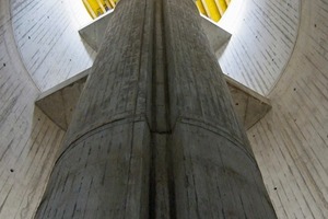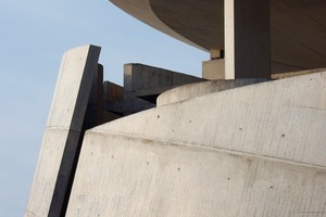 Der Beton als einheitliches Material unterstreicht den monolithischen Charakter. Licht und Schatten strukturieren seine raue Oberfläche besonders im Innenraum, wo sie die geneigten Flächen unterschiedlich schattieren. Insbesondere an der Innenseite der geneigten Betonschale im Rundgang erzielt von oben einfallendes Licht einen Farbverlauf, der sich über die gesamte Höhe des Baukörpers von hell nach dunkel über den Betrachter neigt. Konsequent ist auch das Dach eine Betonscheibe. Deren hohes Gewicht und deren Neigung stellte die Techniker aber vor ein Problem in der Realisierung. So montieren sie 25 cm große Kunststoffhohlkugeln zwischen die Bewehrung und gossen dann den Beton in mehreren Schichten. Auf diese Art konnten sie das Gewicht der Scheibe um ein Viertel senken.