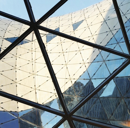 PalaisQuartier heißt das Areal in der Frankfurter Innenstadt, auf dem der italienische Architekt Massimiliano Fuksas das Einkaufszentrum MyZeil als städtebaulichen Eingang plante. Fuksas verteilte die 47 000 m² Verkaufsfläche mit fast 100 Geschäften auf sechs Stockwerke und umhüllte seinen Entwurf mit einem prismatisch unterteilten gläsernen Schalentragwerk aus Sonnenschutzisolierglas. Die ungezwungene, fließende Bewegung dieser Schale verleiht dem neuen Gebäude ein hohes Maß an Aufmerksamkeit. Eine außergewöhnliche Geste ist die bis in die Erdgeschosszone gezogene Öffnung im Dach. Wie ein zu Kristall erstarrter Wirbelsturm durchstößt die fast 15 000 m² große Glaskonstruktion das Gebäude und integriert damit einen in allen Stockwerken erlebbaren Himmelsblick. Der Glasaufbau besteht bei MyZeil aus einer ESG-H Scheibe mit Vision 50 in 10 mm Dicke und einem VSG Glas aus 2 x TVG 8 mm mit einer 1,52 mm Zwischenfolie.