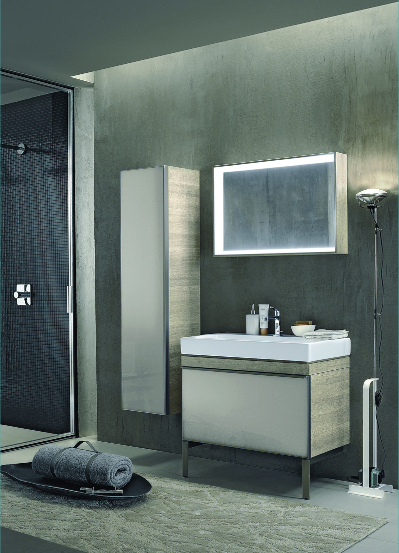 Design wurde um die Holzstruktur Eiche-Tranché Naturbeige und die Glasfrontplatten durch die Farbe Taupe ergänzt. Damit steht den Badprofis ein breit gefächertes Ange-