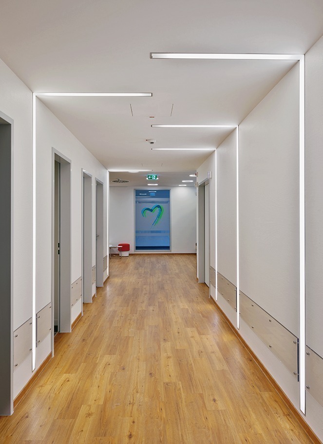Vorstellung des Innenausbaus hatten, beliessen die Architekten die Gänge zu den Praxen möglichst neutral – weiße Wände und Holzboden. Dadurch sind lange Flure entstanden, um die Praxisräume entlang der Fassade anordnen zu können. Manchmal ist es schwierig sich zu orientieren, da das hauseigene Leitsystem im Haupt-, Westhaus und Forum K sukzessive angebracht und erweitert wird.