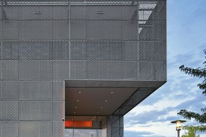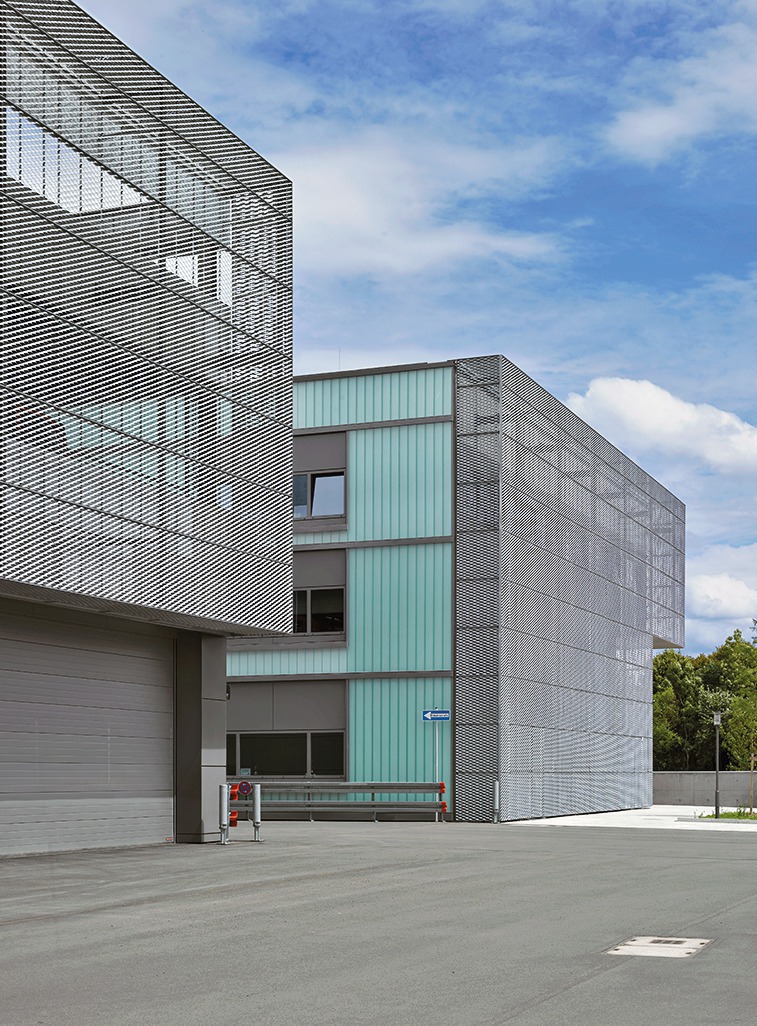 „Zu den weiteren Herausforderungen der Planungen gehörten Brandschutzthemen, schließlich koppelt das Gebäude viele unterschiedliche Funktionsbereiche miteinander“, erinnert sich Hofmann. So mussten der Kalt-riegel und die einzelnen Lagerebenen des Hochregallagers gesprinklert werden, während die restlichen Bereiche kaskadenförmige Fluchtwege und -treppen mit Ausgängen hinter der Streckmetallfassade bzw. zur Magistrale erhielten. Für den Fuhrpark standen darüber hinaus exakte Fahrzeuglisten mit detaillierten Größenangaben zur Verfügung, sodass die dreigeschossige Parkgarage mit Hilfe eines Verkehrsplaners maßgeschneidert werden konnte. Dabei wurden die Positionen der Stahlstützen entsprechend der Schleppkurven der Fahrzeuge so optimiert, dass diese nun souverän rangieren können.