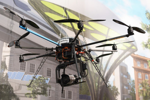 Multirotor-UAS-Plattform ein, die für die Inspektion von Gebäuden (aber auch Brücken, Türmen, Hochhäusern etc.) genutzt wird. Für diesen Anwendungsbereich sind zerstörungsfreie Prüfverfahren verfügbar, wie visuelle Inspektion, Radar, Laser oder Thermographie. Die gesammelten Bild- und Videoergebnisse werden anschließend zur Erstellung hochqualitativer digitaler Gebäuderekonstruk-