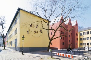 Die Aufgabe, die sich Jo. Franzke Architekten, Frankfurt a. M., stellte, war keine leichte. Sie hatten unter zahlreichen Gestaltungsauflagen die Umwandlung des ehemaligen Adelsitzes Frankensteiner Hof in ein Sozialrathaus und Bürgeramt mit Wohnungen und Ateliers zu planen. Der behutsame Umbau erhält das Gebäude als Kind seiner Zeit, öffnet sich jedoch zu seiner Umgebung. Zu diesem Zweck wurden hohe Schaufester in die Ostfassade gebrochen, die Einblicke in die dort neu eingerichteten Künstlerateliers erlauben. Von wesentlicher Bedeutung für die Neuordnung des Ensembles ist ein turmartiges Haus an der Großen Rittergasse. Der viergeschossige Neubau mit insgesamt neun geförderten Wohnungen inszeniert ein neues Entrée für Alt-Sachsenhausen. Schmale Giebel und spitze, mit Metall gedeckte Dächer nehmen Bezug auf die für das Quartier typische Kleinteiligkeit. Das Gebäude ist wie die meisten Häuser im Viertel verputzt.