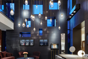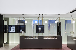 Gezielt angeordnete, aber frei verteilt wirkende Kugelleuchten über den Beraterplätzen sorgen für die Aufhellung des Gesichts bei der Schmuckanprobe. Den Einsatz speziell dieses Produkts wünschten sich die Projektverantwortlichen bei Ippolito Fleitz aus gestalterischen Gründen. Das war in dem gesamten Projekt die einzige Vorgabe für Gerd Pfarré. Weitere dekorative Leuchten finden sich in dem zweigeschossigen Zentrum des Juwelierladens, das Teil des historischen Kiesel-Hauses ist. Dieses Zentrum wird von einem großen, kreisrunden Deckenrücksprung dominiert, aus dessen vergoldeter Oberfläche ein Bündel von 40 frei angeordneten Glasleuchten abgependelt wurde.