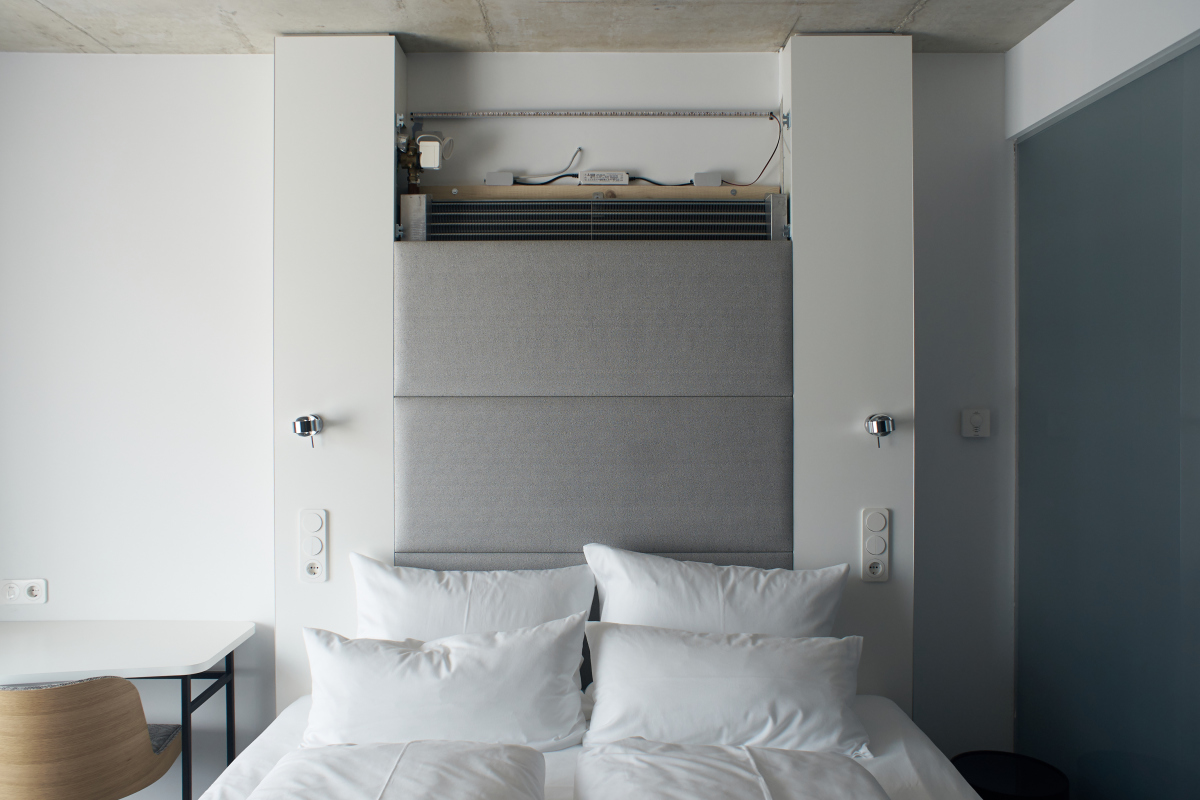 Dezentrale Abluftventilatoren im Bad sichern die Grundlüftung der Hotelzimmer. Die Frischluft strömt über ein Fassadenintegriertes passives Nachströmelement in das Hotelzimmer. Der Betrieb des Abluftventilators erfolgt in der Regel in zwei Stufen: