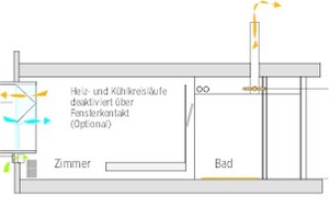 Die dezentralen Badabluftventilatoren führen die Luft ab, frische Luft strömt (passiv) nach durch in die Fassade integrierte Bauteile. Diese passiven Nachströmelemente liegen in der Fassade oberhalb des Fassadenkonvektors. So vermag dieser die nachströmende Außenluft in der Heizperiode vorzuwärmen und beugt Zugerscheinungen vor.