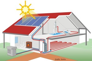Mit der Luft/Wasser-Wärmepumpe SolvisVaero und einer Solaranlage bietet Solvis ein technisch abgestimmtes Kompaktsystem. Die Solaranlage reduziert den Stromverbrauch zusätzlich, da die Wärmepumpe seltener in Betrieb ist. Das Herzstück des Gesamtsystems ist der Energiemanager SolvisMax. Wenn die Sonne nicht ausreicht, holt sich die Wärmepumpe die Energie aus der Umgebungsluft. Selbst an kalten Wintertagen bei -20 °C erreicht sie Vorlauftemperaturen von bis zu 60 °C. Das System bietet effiziente Speicherung der Solarwärme über Schichtenlader, immer frisch erwärmtes Wasser aus der Leitung durch den geschlossenen Kreislauf im Pufferspeicher, einfache Steuerung über eine einzige Schaltzentrale, kontinuierliche Datenaufzeichnung per Datenchip zur Anlagenbeobachtung sowie die Möglichkeit der Anbindung weiterer Energiequellen. Die Luft/Wasser-Wärmepumpe ist in den Leistungsklassen 8, 11 und 15 kW erhältlich.