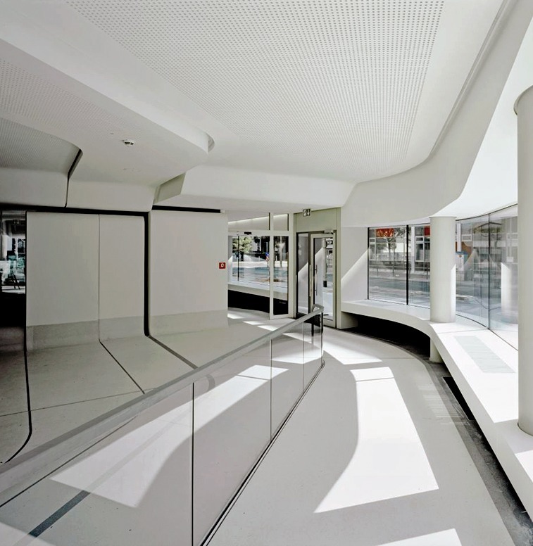 Ein Wettbewerbsgewinn dagegen war das Ordnungsamt ebenfalls im Frankfurter Gallusviertel. Das Flächenprogramm eines mittleren Hochhauses formten die Architekten zu einer 6-geschossigen Gebäudeschleife. Die mehrfachen Krümmungen des eleganten Volumens wiederholen die Kurvenbewegung der nahen Bahn- und Stadtbahngleise im Süden, vermitteln aber gleichzeitig zu der orthogonal geprägten Blockrandbebauung in den anderen Himmelsrichtungen. Die Fassade erstreckt sich auf 300 m Länge, doch die Schlangenform sowie die Entscheidung, die Seiten farblich zu differenzieren, mildern die Mächtigkeit des Baus. Es gibt weder Innen-, noch Außenseite, keine Straßen- und keine Hoffront.