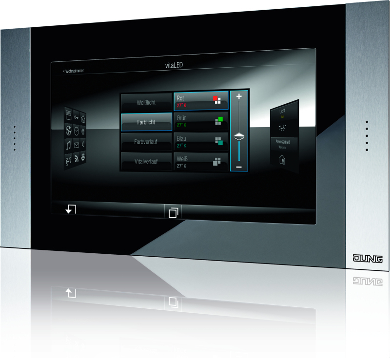 Jung bindet nun die Steuerung des Farblichtsystems vitaLED von Brumberg in die KNX-Haustechnik ein. Die vitaLED-Lichttechnik bietet ein angenehmes und natürliches Farblicht, das gleichmäßig im Raum verteilt wird. Auch der gesamte Bereich des Weißlichts lässt sich stufenlos regeln. Mit einer tageszeitabhängigen Steuerung der Lichtspektren und Lichtfarben werden positive, nichtvisuelle Beleuchtungseffekte genutzt. Mit der Jung Software Facility-Pilot lässt sich vitaLED in die KNX-Haustechnik integrieren. Alle Funktionen zusammen werden über eine einzige Bedienoberfläche per Touch geregelt.