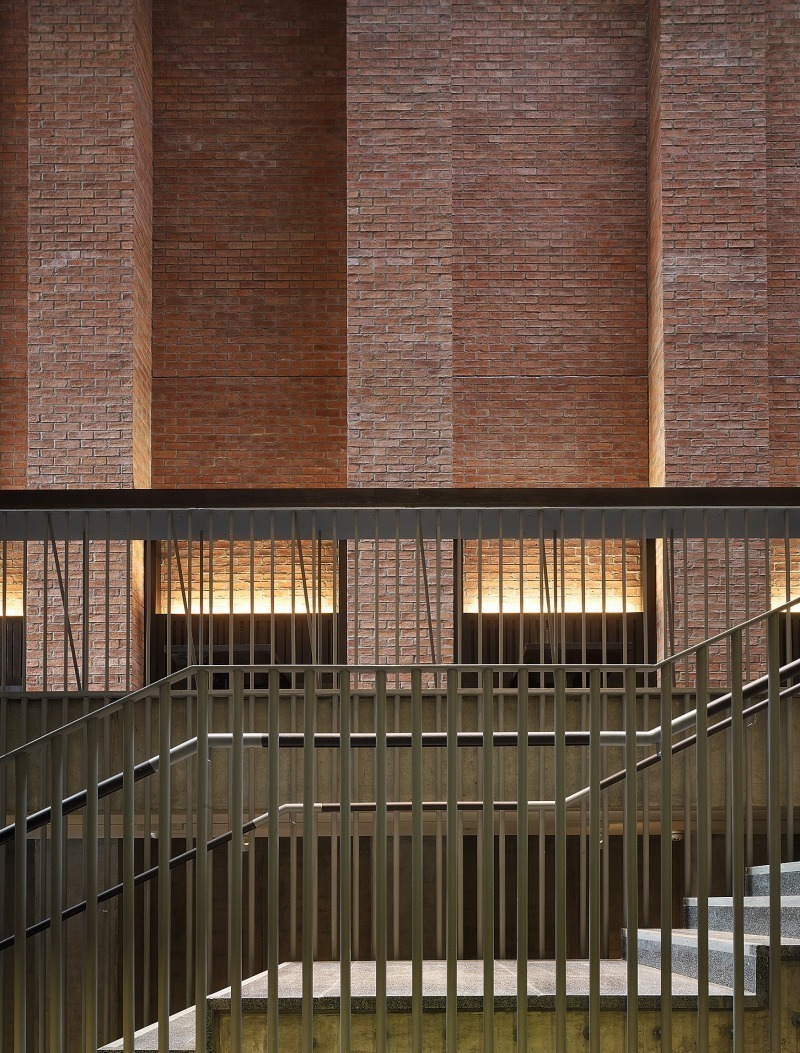Die perfekt ausgeführte Betonschale und die im Foyer gegenüberliegende, präzise gemauerte Ziegelwand könnten gegensätzlicher nicht sein. Und doch bilden sie in ihrer ästhetischen Vollkommenheit eine Einheit, vor allem, wenn das Licht der Nachmittagssonne in breiten Streifen über die Wände wandert, Schatten in das Relief der Betonwand zaubert und jeden einzelnen Ziegel schimmern lässt.