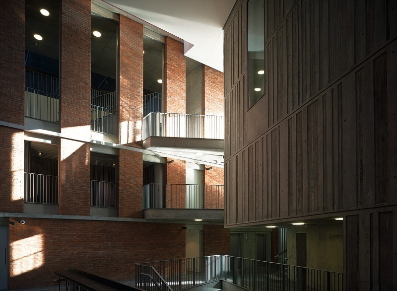 Anders als der Turm sind die links und rechts angrenzenden Hauptbaukörper mit rauen, roten Ziegeln verkleidet. Diese sorgfältig ausgearbeitete Ziegelhülle bestimmt in der Kombination mit Sichtbeton auch die mehrere Geschosse hohe Foyerhalle im Inneren. Beinahe etwas zu viele verschiedene Materialien und etwas zu viel kunstvoll zelebrierte Materialästhetik, ist der erste Eindruck. Doch Architekt Ian McKnight erklärt das Zusammenspiel von Ziegel, Basalt und Beton aus der Baugeschichte Belfasts: Aus Ziegeln sind die Geschäfts- und Lagerhäuser des historischen Marktdistrikts rund um die Kathe-drale erbaut. Sie sind das traditionelle Baumaterial Belfasts, während Beton für die Gegenwart steht. Der unweit der Stadt abgebaute Basalt wird hier seit Jahrhunderten für repräsentative Fassaden verwendet. Die Architekten verstehen den Innenraum des Kunstzentrums, der mit jedem Schritt die Treppen hinauf neue Ausblicke eröffnet, als Fortsetzung der verwinkelten Gassen, Plätze und Höfe des Quartiers im Kleinen. Folglich ist auch der Innenraum voll überraschender Dramaturgie.