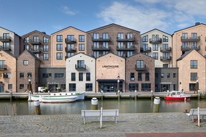 Das große Bauvolumen wurde in kleinteilige einzelne Baukörper aufgeteilt und vermittelt einen typisch norddeutschen Hafencharme. Auf die Betrachter:innen wirkt das Lighthouse Hotel & Spa dadurch wie ein Ensemble unterschiedlicher Gebäude, das neben dem Hotel auch drei Restaurants, Tagungsräume, einen Feinkostladen, zwei Shops, einen Spa-Bereich und eine Hafenkneipe beherbergt. Durch das zweigeschossige Foyer, an das Bibliothek und Kaminzimmer angrenzen, gelangt man über eine Wendeltreppe in die Gästezimmer, die mit edlen Möbeln ausgestattet und in dezenten Wandfarben gestrichen sind.