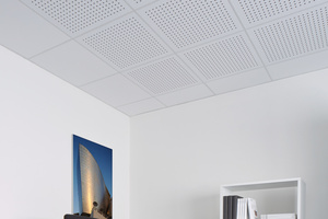 Die vlieskaschierte Mineralplatten der Linie Chess von OWA sind mit einem Schallabsorptionswert von NRC = 0,85 ideal für Räume mit hohem Anspruch an eine gute Sprachverständlichkeit geeignet. Die aufgedruckten quadratischen Lochmuster auf der glatten, weißen Untersicht wirken natürlich, ohne die hygienischen und brandschutztechnischen Nachteile mitzubringen, wie sie eine tatsächlich gelochte Akustikdecke aufweisen würde.