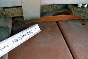 Im nicht ausgebauten Dachraum war die Unterseite der Biberschwanz-Ziegel einsehbar. Dort waren auch die Dachhaken ersichtlich, die zur Befestigung der Photovoltaik-Anlage dienten. Die Dachhaken waren jeweils mit einem Distanzholz auf dem Sparren befestigt (Bild 2). Die Dachuntersicht wurde stichpunktartig im Hinblick auf Undichtigkeiten – insbesondere in den Bereichen der Dachhaken – untersucht. Dabei wurden keine Hinweise auf vorhandene Undichtigkeiten festgestellt.