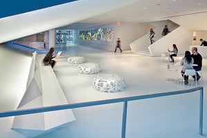 arbeiten wir mit Überlagerungen von Räumen und Inhalten.“ Wandflächen werden überlagert mit Filmprojektionen. Gleich am Eingang bildet eine 15 m lange Wand zusammen mit dem Boden eine Projektionsfläche. Dahinter beginnt die offene Treppe und führt auf die erste Ebene zu einer Sitzlandschaft mit Bänken aus weißem Corian. Quasi als Röhre führt die Treppe weiter nach oben und endet scheinbar in einem schwarzen Loch – auf der Ebene für Wechselausstellungen. Was Leeser besonders wichtig ist: „Dass es sich bei diesem Projekt um ein öffentliches Bauvorhaben handelt. Während Museen in Deutschland meistens öffentliche Bauvorhaben sind, finanzieren fast ausschließlich Privatleute und Stiftungen die amerikanischen Museen.“