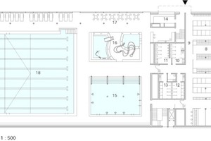 Keine Frage, der Schwimmbadbetrieb ist auch in Oberursel ein Zuschussgeschäft. Doch wie kann man Frei- und Hallenbad so kombinieren, dass der Badebetrieb durch eine gemeinsame Infrastruktur möglichst kostensparend und ganzjährig funktioniert? Sacker Architekten planen eine Badeplatte, auf der sich alle Schwimmbecken verteilen – Innen und Außen als Einheit in einer Parklandschaft. Das Foyer und der daran anschließende Funktionsbereich mit Duschen und Umkleiden dienen beiden Bädern gemeinsam; von hier aus sind beide Bäder direkt zugänglich. Die Verbindung mit der Parklandschaft ist noch nicht perfekt, das Freibad noch nicht saniert, und noch trennt ein Höhenversatz die Bäder. Trotzdem prägen vor allem die Belichtung und der Ausblick die Schwimmhalle. Während die Südfassade das Bad nach Außen abschottet, öffnet sich die Nordfassade mit Gläsern im Panoramaformat und mit sechs zweiflügeligen Glastüren.