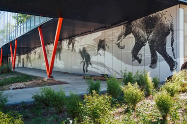laminat ist ungefähr 10 mm; das innere Laminat 6 mm dick. Die facettierte Geometrie der Fassadenelemente folgt einem parametrischen Ansatz und optimiert die Energieeffizienz des Gebäudes. Der vorspringende, obere Teil des Paneels kann je nach Lage und Ausrichtung variieren. Er bietet Verschattung und reduziert damit Kühllasten. Aufgrund der geringen Wärmeleitfähigkeit von Bioverbundwerkstoffen ermöglichen diese integrierten Verschattungselemente eine hochgedämmte und dazu wärmebrückenfreie Außenhaut, die dem Passivhausstandard entspricht.