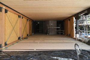 Da die Ausstellung als Black Box konzipiert ist, verschwindet die Wandkonstruktion hier hinter Einbauten. So war eine dem Lastverlauf angepasste hybride Bauweise möglich: BauBuche-Binder mit stehenden Pfosten und Zugstangen-Auskreuzung gehen über in Stahlfachwerkträger in V-Geometrie.