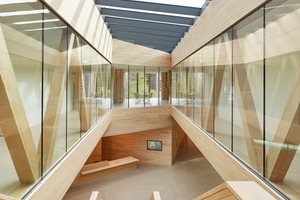 Leicht verschoben bilden Riegel G und H darauf das Obergeschoss: Sie lagern nur zur Hälfte auf E und F und überspannen dann das Foyer bis zu Riegel D, der in Shop und Foyer noch auf Erdreich ruht, dann aber zum Skywalk mutiert und eine Brücke zum Turm schlägt. Der Vorgabe folgend, möglichst viel heimisches Holz zu verwenden, bestehen die imposant sichtbar belassenen, raumhohen Fachwerkträger aus BauBuche (G, H) und Weißtanne (D).