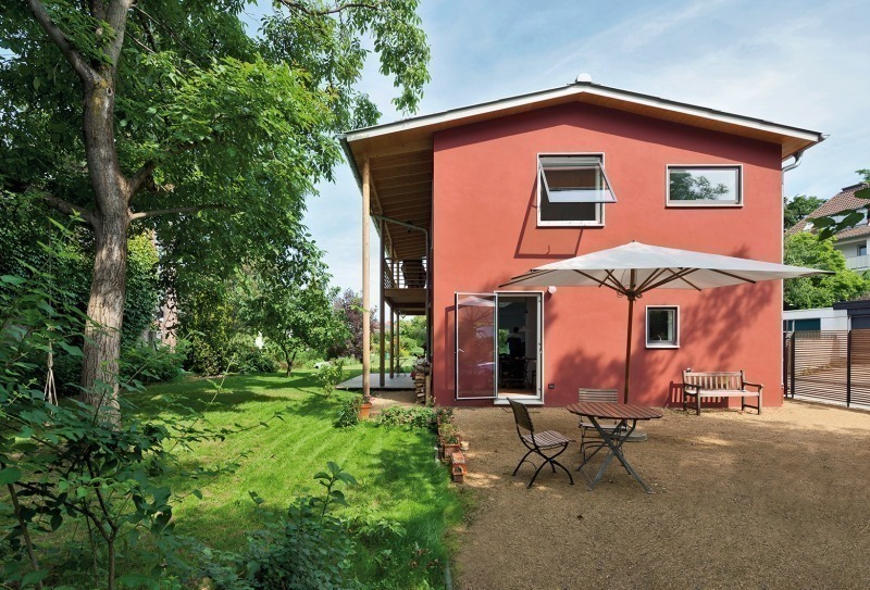 Mit seinem oxidroten Kalkputz fügt sich das Wohnhaus harmonisch in das städtische Umfeld und den umliegenden Baumbestand ein. Den von einem weiten Dachüberstand geschützten Balkon auf der Gartenseite tragen glattgeschliffene Rundholzpfosten. Die scheinbar spielerisch über die Fassade verteilten Holz-Aluminium-Verbundfenster folgen mit ihren schlanken, nach außen hochklappbaren Profilen den unterschiedlichen Wünschen nach Ausblick, Sonneneinfall und Belichtung. Das schmale Fensterband in der Küche leuchtet die Arbeitszeile mit Südwestsonne aus. Die tief herabgezogenen Fensterbrüstungen im Wohnraum und Schlafzimmer erlauben auch im Sitzen oder Liegen den Blick in den Garten. An den kleinen Ostfenstern der Eingangsseite wurden die Laibungen abgeschrägt, um die Morgensonne besser einzufangen. Selbst die Garderobe bekommt durch ein Innenfenster Licht aus dem benachbarten, hellen Treppenraum.