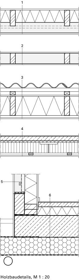 Die vorgefertigten Holzrahmen- und Massivholz-Deckenelemente wurden in wenigen Tagen aufgebaut und mit einem leicht geneigten Dach aus großformatigen Faserzement-Wellplatten gedeckt. Um die Montage zu beschleunigen, kamen die Holzrahmen samt Querstreben und Stützen sowie einseitig mit aussteifenden Gipsfaserplatten beplankt auf der Baustelle an. Die Innenwände fachten die Handwerker mit stranggepressten Lehmsteinen aus, die sie mörtelfrei in die offenen Gefache stapelten und mit Klemmleisten befestigten.