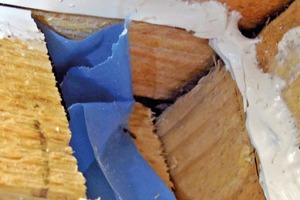 Bei einer weiteren Untersuchungsstelle im Bereich eines Schadensbildes bei der Traufe war die Ausführung gleichartig erfolgt: Die als Dampfsperre bzw. Luftdichtheitsschicht dienende PE-Folie war mittels Latten und komprimierbaren Dichtbändern an der Dachschalung und dem Sparren fixiert. Eine Verklebung der Folie war nicht vorhanden (Bild 7). Zwischen dem Sparren und den Brettern der Dachschalung war ein ca. 1−2 mm breiter Spalt vorhanden (Bild 8).
