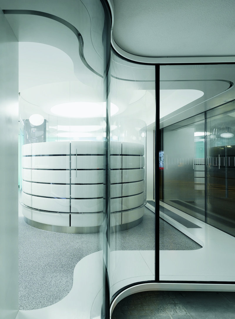Schon von weitem schiebt sich die geschwungene Glasfassade mit ihrer freigestellten Eckstütze subtil in das Auge des Passanten und ein geheimnisvoller grüner Schimmer macht neugierig. Lichtwände im Inneren lassen die Firmenfarbe des Unternehmens in den Außenraum fließen. Für Dynamik sorgt eine Art Scannerstreifen, der von Zeit zu Zeit die hinterleuchteten Wände durchwandert. Ebenso das geschäftige Treiben im neuen Kundenservicezentrum mit Öffnungszeiten von 7.45 bis 20.00 h. Im Dreischichtbetrieb sorgen rund 40 Mitarbeiter für das Wohlergehen ihrer Kunden und helfen, materielle Schäden schnell zu beheben. Dass das rund 1 000 m2 große Servicezentrum auch als Werbemittel für den Passanten auf der Straße dienen sollte, war von vornherein erklärtes Ziel. Die Arbeitsplätze sind daher bewusst an den Schaufenstern angeordnet; dass hier gearbeitet wird, ist offensichtlich. Für Ippolito Fleitz keine leichte Planungsaufgabe, galt es doch, den Spagat zwischen größtmöglicher Transparenz und maximaler Diskretion zu schaffen.