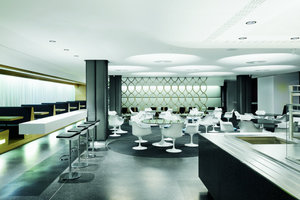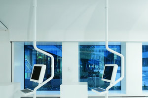 Im Rahmen des Umzugs in das neue Servicezentrum vollzog das Unternehmen auch den Schritt zum papierlosen Büro. Große Aktenschränke sucht man daher vergebens. Einzig das vom Kunden zu unterschreibende Formular wird noch ausgedruckt. Der Verzicht auf Stauraumflächen wirkt sich durchweg positiv auf die Raumsituation aus. In dem langgestreckten, offenen Raum sind die einzelnen Kundenbetreuungsplätze sequentiell, zur Fassade leicht abgewinkelt angeordnet. Die Arbeitsplätze bestehen aus einem Tischmöbel, das nach oben bis zur Decke weitergeführt wird. Durch seine Form und Materialität gewährleistet es räumliche und akustische Diskretion. Die integrierte Beleuchtung sorgt nicht nur für ausreichende Beleuchtungsstärken, sondern unterstützt auch das Raum-im-Raum-Gefühl, hat man einmal in der virtuellen Kapsel Platz genommen. Darüber hinaus rhythmisieren Uplights über den Funktionseinheiten den großzügigen Raum. Der nahezu fugenlos durchgehende Terrazzoboden fasst den Raum als Einheit und gibt ihm optische Ruhe.