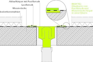 Bei beiden untersuchten Abläufen liegt zunächst ein technischer Mangel hinsichtlich des Einbaus der Ablaufkörper vor. Diese wurden jeweils derart montiert, dass sich ein Hochpunkt in der Abdichtungsebene beim Ablauf ergibt. Eine Entwässerung der Abdichtungsebene – wie in der DIN 18195-5 gefordert – ist dadurch nicht mehr ausreichend möglich. Die fehlerhafte Einbauposition der Ablaufkörper mit dem Festflansch oberhalb der Massivdecke führt zu der unerwünschten Aufkantung mit einer Höhe, die der Dicke des Flansches entspricht (Bild 11). Wird dann die Abdichtung von der Massivdecke auf den (überstehenden) Flansch geführt, besteht bei der Aufkantung ein deutlich erhöhtes Schadensrisiko (vgl. Bild 6). Korrekt wäre der Einbau der Ablaufkörper derart, dass die Oberkante des Flansches bündig mit der Oberkante der Massivdecke liegt (Bild 12). Einige Hersteller geben das entsprechende Maß ausdrücklich in den Montageanleitungen vor.