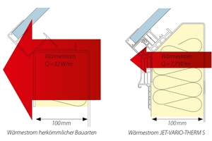 Das Lichtband JET-Vario-Therm kombiniert gute Wärmedämmung mit hoher Tragfähigkeit und der Vermeidung von Wärmebrücken. Erreicht wird dies durch ein Kompositprofil, bestehend aus PVC-Basis- und Aluminium-Abdeckprofil, in Verbindung mit einem dämmenden PVC-Zargenanschlussprofil. Dieses hochenergieeffiziente Lichtband hat die JET-Gruppe noch einmal optimiert – und zwar mit dem Vario-Therm-Klappensystem. Die Konstruktion für Seiten- und Kämpferklappen der Serie ist thermisch getrennt und dadurch vollständig wärmebrückenfrei. Die Labyrinth-Dichtung, bestehend aus einer umlaufenden, doppelten EPDM, verspricht Wasser- und Luftdichtigkeit.Die Aufbauhöhe beträgt 29 mm, unabhängig von der gewählten Verglasungsstärke. Je nach eingesetzter Verglasung und Abmessungen des Lichtbandes, kann das JET-Vario-Therm-System Uw-Werte von bis zu 1,2 W/m²K erreichen. Erhältlich ist die neue Klappenkonstruktion in Abmessungen bis 2 x 2,50 m.