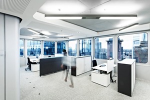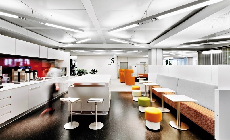 Heute verzahnen sich entlang der Fenster die Abteilungs- und Projektgruppen in Ein- und Viertischformationen, im Innenraum wechseln kleine und große Besprechungsräume mit Denkzellen, Druckzentren und dem Meetingpoint . Großzügige Glaswände helfen Helligkeit in den Raumtiefen zu erhalten; Möbel und Trennwandsysteme setzen frische Farbpunkte in die weiße Silbergrauheit. Die offene Küchenlounge ist flächig eingekapselt, um Störungen im Arbeitsbereich vorzubeugen. Sie ist Kommunikations-, Arbeits- und Ruhezone, stiftet Orientierung entlang der Verbindungsachse zu den Kern- und Funktionsbereichen. Neben Druckerzentren und Kantine ist sie der wichtigste Treffpunkt für Ad-hoc-Gespräche, die bekanntlich langwierige Terminkoordinationen reduzieren.