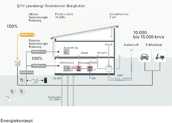 der Bewohner genutzt werden. Die Prognose sah vor, dass rund 15 000 km im Jahr mit selbst produziertem Strom gefahren werden können. Im Monitoring wurden in beiden Jahren Energieüberschüsse ermittelt. Der erzielte jährliche Energieüberschuss beträgt seit der Inbetriebnahme in 2011 im Mittel rund 44 % bezogen auf den Jahresstromverbrauch von ca. 10 800 kWh/a.